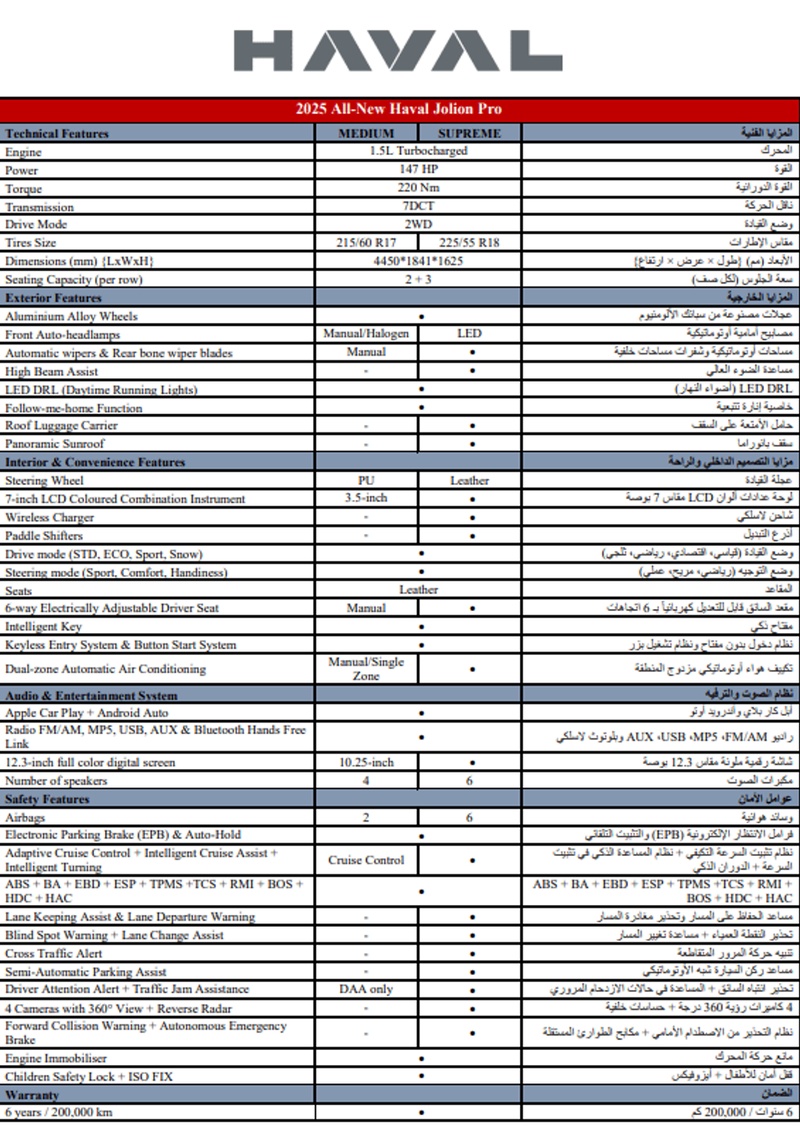 Представляем новый Haval Jolion 2025 года выпуска, оснащённый бензиновым двигателем объёмом 1.5 литра с турбонаддувом и автоматической коробкой передач. Автомобиль имеет передний привод и комплектацию Pro, которая включает современное мультимедийное оборудование, удобные сиденья и расширенный набор систем безопасности. Пробег составляет всего 18 тыс. км, что свидетельствует о практически неиспользованном состоянии транспортного средства. Поскольку автомобиль импортирован из Объединённых Арабских Эмиратов, он эксплуатировался в благоприятных климатических условиях с качественным дорожным покрытием, что способствовало сохранению ходовой части и кузова в отличном состоянии. Интерьер сохранил заводскую свежесть без признаков износа, а техническое обслуживание проводилось согласно регламенту производителя. С учётом минимального пробега и отсутствия зафиксированных повреждений или страховых случаев можно сделать вывод о безупречном состоянии данного автомобиля, которое соответствует новому транспортному средству. Haval Jolion идеально подходит для городской эксплуатации и длительных поездок по трассе, демонстрируя оптимальный баланс комфорта и экономичности. Автомобиль находится в Объединённых Арабских Эмиратах и доступен к покупке с последующей доставкой в Россию.