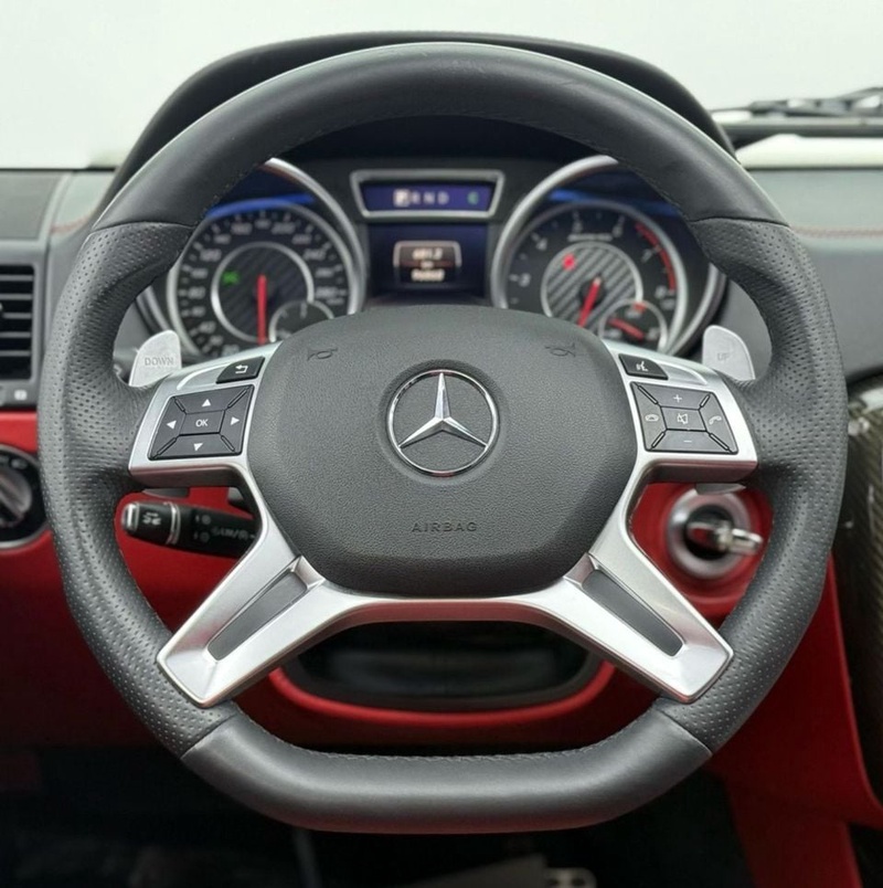 Mercedes-Benz G-Class 2018 года выпуска представлен в кузове SUV с бензиновым двигателем объемом 5.6 литра и системой полного привода AWD. Автомобиль оснащен автоматической трансмиссией и имеет пробег около 97 тысяч километров, что свидетельствует об умеренной эксплуатации преимущественно в городских условиях с редкими выездами на трассу. По данным осмотра, автомобиль не имеет зафиксированных повреждений кузовных элементов и страховых случаев, что указывает на аккуратную эксплуатацию и бережное отношение предыдущего владельца. С учетом пробега, техническое состояние соответствует ожидаемому уровню для данного возраста – сохранена оригинальная отделка салона в красном цвете, поддерживается регулярное обслуживание у официального дилера Mercedes-Benz. Комплектация включает стандартное оснащение G63 AMG Centennial Edition с 21-дюймовыми колесными дисками. Автомобиль находится в ОАЭ и доступен к покупке с последующей доставкой в Россию.