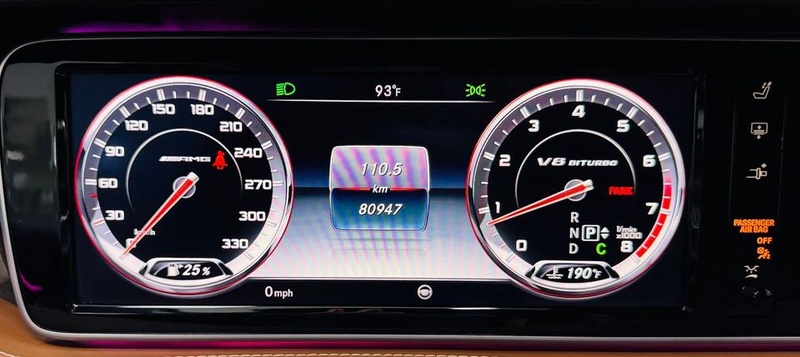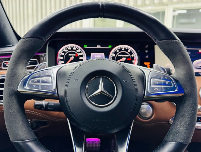 Mercedes-Benz S-Class 2016 года выпуска представлен в кузове седан с полным приводом AWD и автоматической коробкой передач. Автомобиль оснащён бензиновым двигателем V8 мощностью 585 л.с., который обеспечивает уверенную динамику разгона и плавность хода. Комплектация S63 AMG включает спортивный обвес, кожаный салон коричневого цвета, 20-дюймовые легкосплавные диски и расширенный пакет электронных систем помощи водителю. Пробег составляет 80 тыс. км, что свидетельствует об умеренной эксплуатации преимущественно в городских условиях с редкими выездами на трассу. По данным осмотра кузовные элементы не имеют повреждений, сохранность лакокрасочного покрытия и интерьера соответствует пробегу — отмечаются минимальные следы эксплуатации на сиденьях и рулевом колесе. Страховая история отсутствует, что указывает на аккуратное вождение и отсутствие серьёзных инцидентов. Техническое обслуживание проводилось регулярно у официальных дилеров, все системы функционируют штатно. Автомобиль находится в Объединенных Арабских Эмиратах и доступен к покупке с последующей доставкой в Россию.