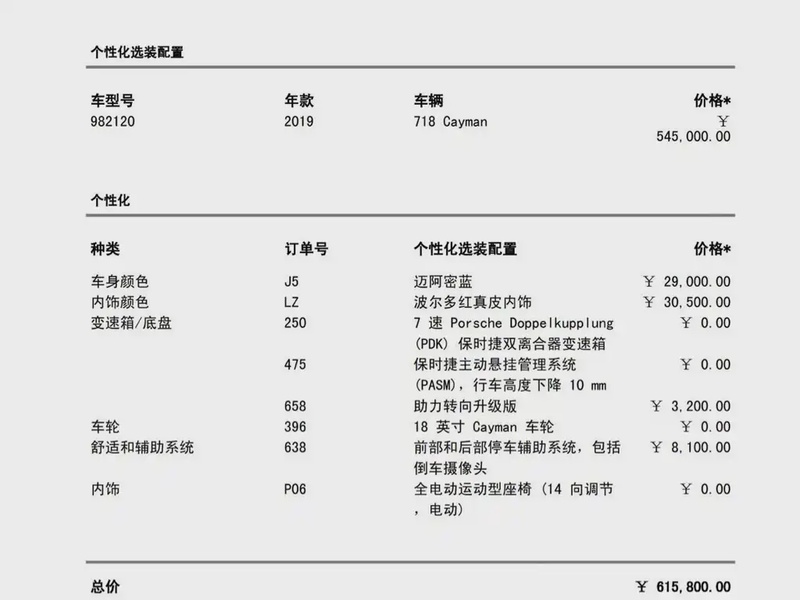 Модель Porsche 718 2018 года выпуска оснащена бензиновым двигателем объёмом 2.0 литра с турбонаддувом, расположенным по схеме H4. Автомобиль имеет задний привод (RWD) и относится к комплектации Cayman. Пробег составляет 55 тысяч километров, что для данного возраста является умеренным показателем, характерным для смешанного режима эксплуатации — как городского, так и загородного. По данным осмотра кузовные повреждения отсутствуют, а интерьер сохранился в хорошем состоянии, что свидетельствует об аккуратном обслуживании и бережной эксплуатации. Страховая история не содержит обращений, что указывает на отсутствие серьёзных инцидентов за время владения. С учётом пробега и общего состояния автомобиль оценивается как технически исправный и ухоженный экземпляр. Автомобиль находится в Китае и доступен к покупке с последующей доставкой в Россию.