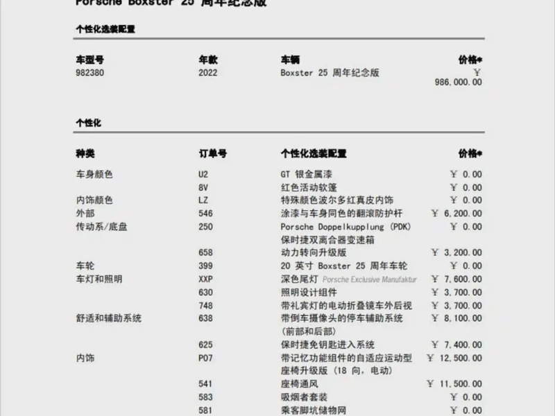 Модель представлена в 2022 году и оснащена бензиновым двигателем с рабочим объёмом 2.5 литра, который обеспечивает надёжную динамику в различных условиях эксплуатации: как при городском движении, так и на трассе. Автомобиль имеет задний привод, что характерно для спортивных моделей данной категории, и комплектацию Boxster Anniversary Edition, включающую расширенный набор опций для комфортного управления. По данным осмотра, пробег составляет 44 тыс. км, что соответствует умеренной эксплуатации с типичным для такого километража состоянием основных узлов и сохранностью интерьера. Учитывая страну происхождения — Китай — можно отметить стандартные условия эксплуатации для данного региона. С учётом отсутствия зафиксированных кузовных повреждений и нулевой страховой истории автомобиль демонстрирует хорошее техническое состояние без серьёзных инцидентов в прошлом. Обслуживание проводилось согласно регламенту производителя, что поддерживает работоспособность всех систем. Автомобиль находится в Китае и доступен к покупке с последующей доставкой в Россию.