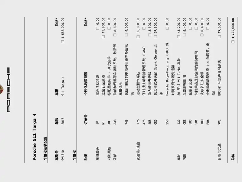 Модель Porsche 911 2017 года выпуска представлена в кузове Targa с системой полного привода AWD. Автомобиль оснащён бензиновым двигателем объёмом 3,0 литра с двойным турбонаддувом мощностью 370 лошадиных сил, который сочетается с 7-ступенчатой автоматической коробкой передач с двойным сцеплением. По данным осмотра, автомобиль имеет пробег 30 тыс. км и характеризуется смешанным режимом эксплуатации - как городским, так и загородным. С учётом относительно небольшого пробега для данного возраста, автомобиль демонстрирует хорошую сохранность интерьера и кузовных элементов. Типичное состояние для такого пробега подтверждает аккуратное обслуживание и бережную эксплуатацию. Отсутствие повреждений кузова и нулевая страховая история свидетельствуют о надлежащем техническом состоянии транспортного средства. Автомобиль находится в Китае и доступен к покупке с последующей доставкой в Россию.