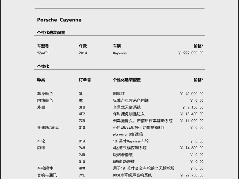 Модель представлена в кузове SUV 2014 года выпуска и оснащена бензиновым двигателем V6 объемом 3.0 литра с механическим наддувом, развивающим мощность 333 л.с. Автомобиль имеет полный привод (AWD) и комплектацию Cayenne 3.0T с автоматической коробкой передач на 8 ступеней. Пробег составляет 155 тыс. км, что соответствует смешанному режиму эксплуатации — городскому и загородному. Учитывая пробег, можно отметить типичное для данного километража состояние: сохранность интерьера оценивается как удовлетворительная, характер обслуживания — регулярный. По данным осмотра, следов кузовных работ не выявлено, а страховая история не содержит обращений с нулевой суммой выплат, что свидетельствует об отсутствии серьезных инцидентов. С учётом страны происхождения — Китай — автомобиль прошёл адаптацию к местным условиям эксплуатации и климату. В целом, состояние транспортного средства оценивается как хорошее для своего возраста и пробега, без критических замечаний по технической части и кузову. Автомобиль находится в Китае и доступен к покупке с последующей доставкой в Россию.