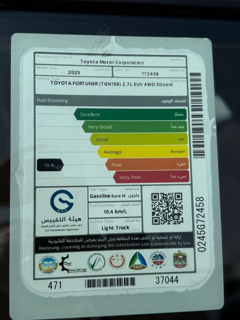 Toyota Fortuner 2025 года выпуска представляет собой полноразмерный внедорожник, оснащённый бензиновым двигателем объёмом 2.7 литра с автоматической трансмиссией. Модель комплектуется системой полного привода и относится к топовой комплектации Full Option, включая 17-дюймовые легкосплавные диски и двухцветную отделку салона в бежевых тонах. Автомобиль имеет нулевой пробег, что свидетельствует о его абсолютно новом состоянии без следов эксплуатации. По данным осмотра кузовные элементы не имеют повреждений, а страховая история отсутствует, что подтверждает безупречное техническое состояние транспортного средства. С учётом заводской сборки и отсутствия эксплуатации можно говорить о полной сохранности всех систем и агрегатов. Автомобиль находится в ОАЭ и доступен к покупке с последующей доставкой в Россию.